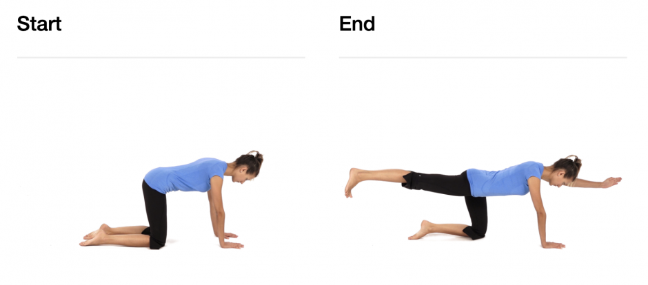 - With the right arm raised, slow lift your left leg. Hold for up to 5s, then switch sides
